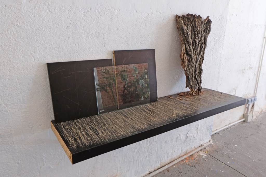 En paralelo, el concepto del libro inspira las obras de la exposición. Los dibujos de líneas son emulaciones de las marcas y huellas dejadas por los cuchillos de los estudiantes de arquitectura de la Universidad Complutense en sus mesas de trabajo y cuestionan el origen de la intervención arquitectónica en el espacio natural, si se encuentra en la naturaleza como espacio o materia prima, o si está en las huellas dejadas en las superficies de las escuelas de arquitectura. Además está presente la mesa de trabajo del artista, donde ha producido la exposición, como un metaespacio creativo, donde las obras que cuestionan el origen da origen a las obras. Los soportes son mesas, maderas, un tronco y cristales encontrados por la ciudad de Madrid.